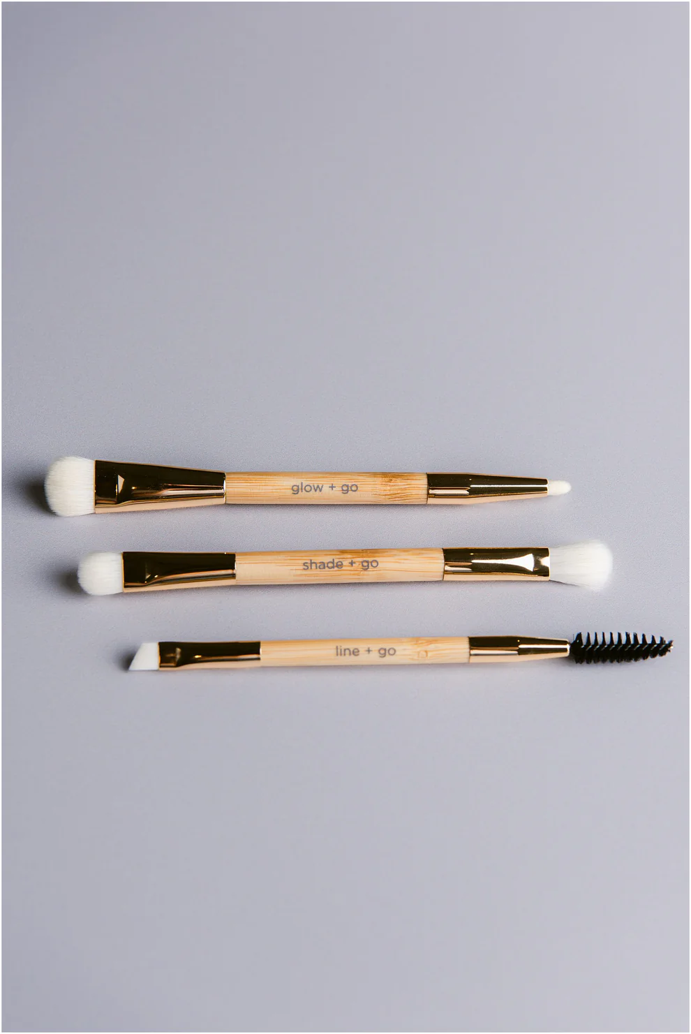 Glow Brush Trio: A focused set of brushes designed for brows, eyes, and small details—truly taking application to the next level. One brush is used for applying your cream foundation, one for eye | glow, and the third for brows. Shop the Glow Brush Trio here.